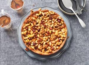 De bovenkant van de taart blijft onbedekt; de noten komen er pas na het bakken op. Zo blijven ze lekker knapperig.