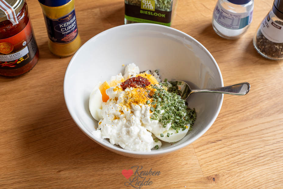 Voor dit recept prak je de gekookte eieren samen met hüttenkäse. Vervolgens voeg je de smaakmakers toe: kerriepoeder, chilivlokken en fijngesneden bosui.
