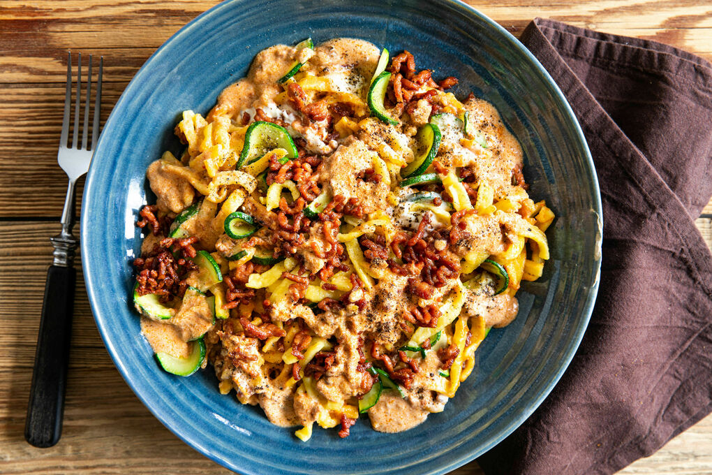 Voeg voor een extra speciale spag bol een flinke scheut rode wijn, wat vegan Worcestershire saus en wat zongedroogde tomaatjes toe.