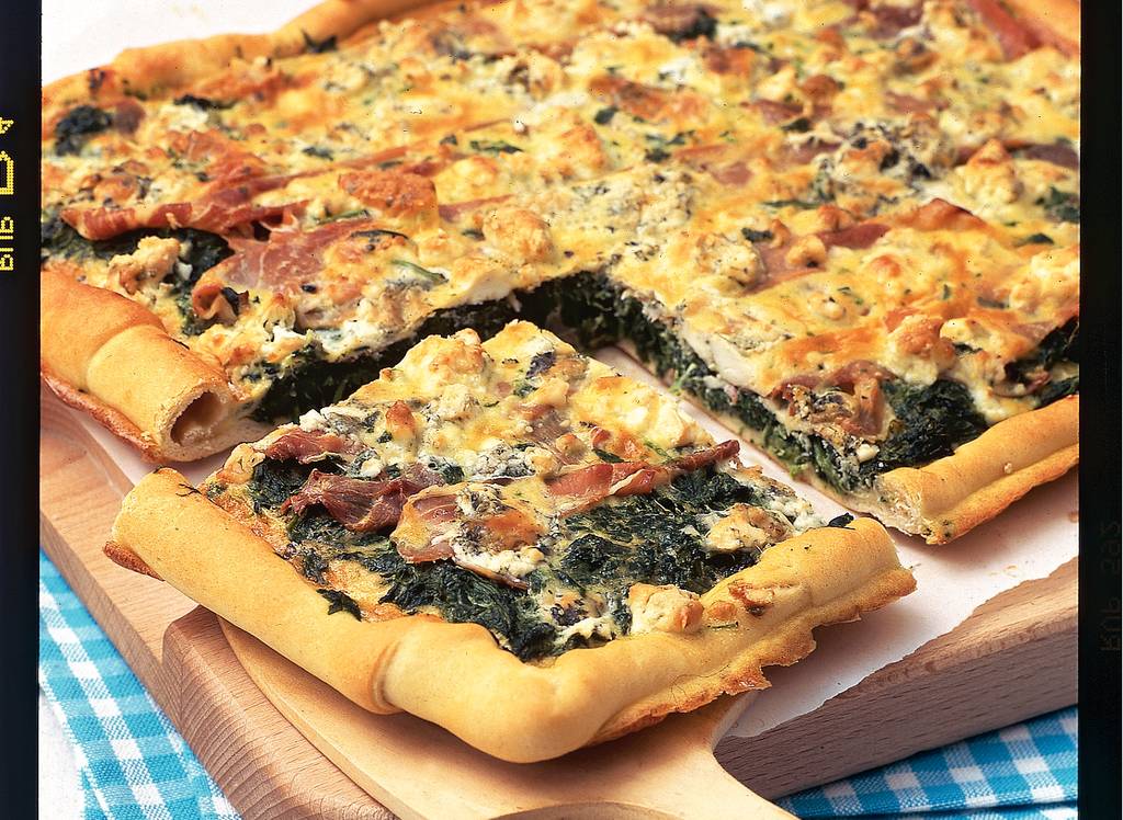 Kneed dat met koele hand tot een bal. Rol het deeg - na minstens een half uur rusten in de koelkast - op een met bloem bestoven werkvlak uit tot een ronde lap, die je in een ingevette lage taartvorm van 24 of 26 cm doorsnede legt. Druk het deeg aan de rand goed aan en snijd het overtollige deeg langs de bovenrand weg. Roerbak voor de vulling gram verse spinazie met 2 teentjes geperste knoflook in hete olijfolie tot de blaadjes gaan slinken.