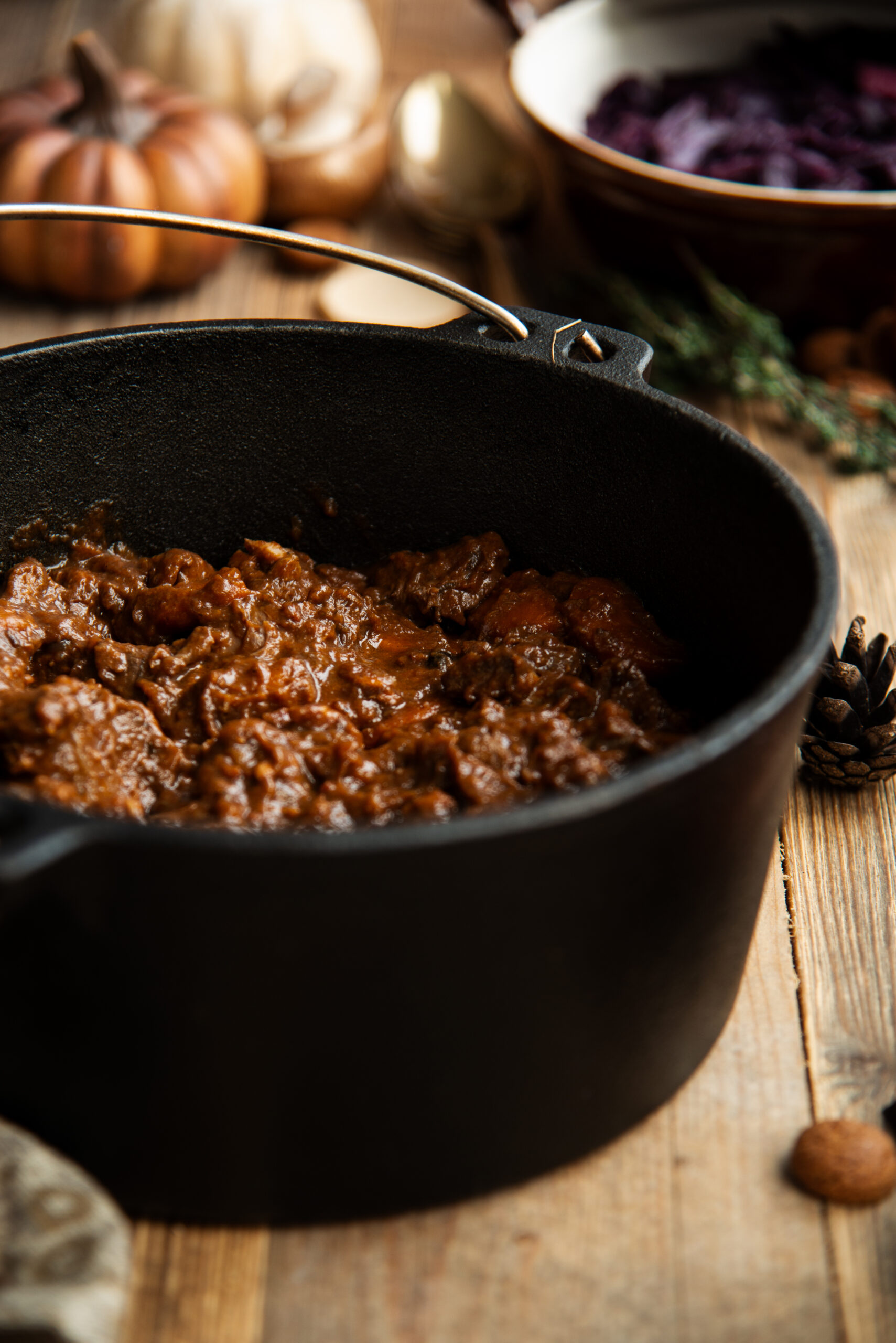 De delicate, ietwat zoete smaak van ree combineert prachtig met de diepe, aardse tonen van de stoof.