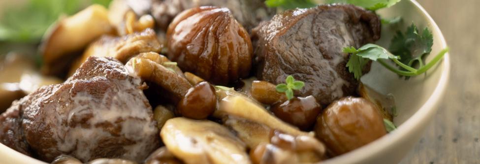 | Stoofpot van ree met boschampignons | Reevlees | Rode wijn | U, knoflook, wortel, sjalot, bloem | Cognac, chocolade, aalbessengelei | - |